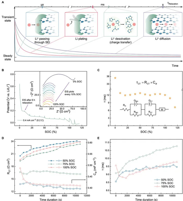 本研究基于弛豫时间检测方法提出了一种新的锂析出起始指示器。通过脉冲/弛豫测试程序可以快速获取石墨负极在电池运行期间的电荷转移过程弛豫时间常数。τCT的急剧下降与锂析出起始之间的关系在半电池中得到验证,并通过修改拟合方程将相同的锂析出起始测定原理应用于Gr||LFP全电池。在不同温度和倍率下的锂析出图谱研究表明,当电池在有利条件下充电时,对应于锂析出起始的电池电压更容易达到。基于电池电压的评估指标对于建立锂离子电池的安全充电协议具有重要意义,为未来指导安全充电程序展现了巨大潜力。