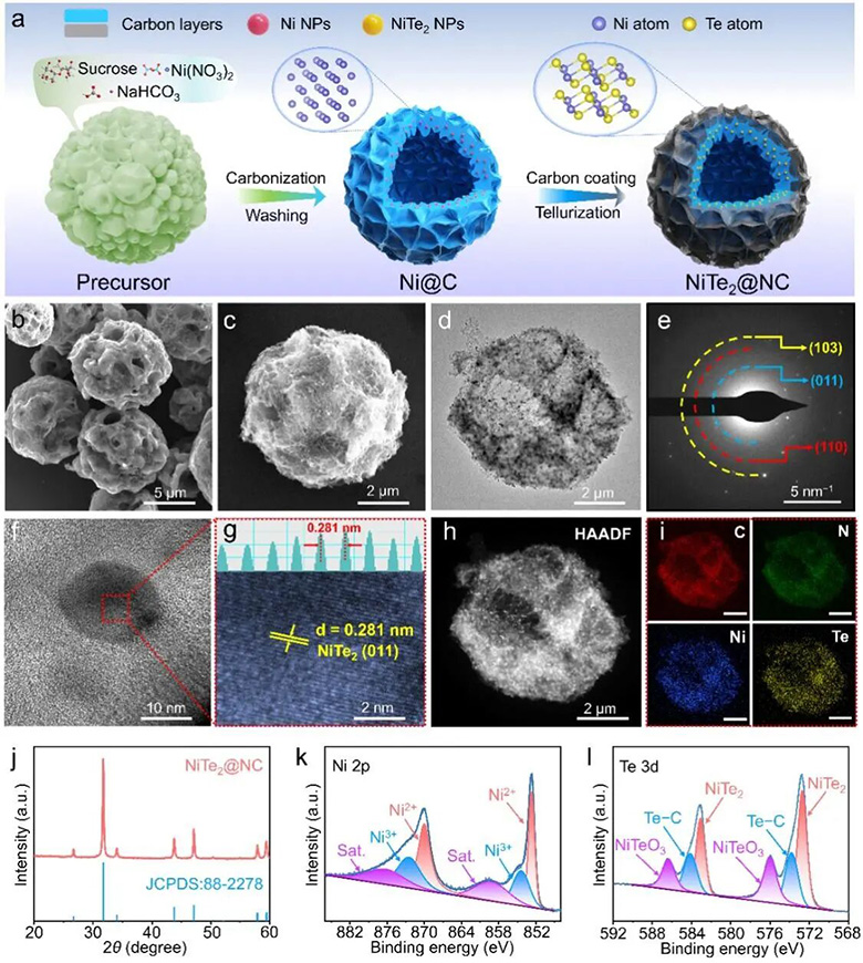 本研究提出中空分级多孔NiTe2@NC复合材料在电化学活化过程中形成的p-block基质被构造为SMA的功能化宿主。p-bolck化合物NiTe2的电化学活化原位生成了具有亲钠活性的Na2Te和高导电性的Ni,这一过程显著降低了钠的成核势垒,并形成了双连续的离子/电子网络,使钠的沉积更加均匀。Na2Te参与形成具有增强的机械强度和离子导电性的富含无机物的SEI,非原位SEM和拉曼光谱进一步验证了NiTe2@NC上钠离子分布均匀和无枝晶的沉积行为。改性复合负极在恶劣条件下实现了出色的循环稳定性。这项工作提供了一个合理的设计范例,高性能钠金属负极通过协同调制基板化学和界面性能。