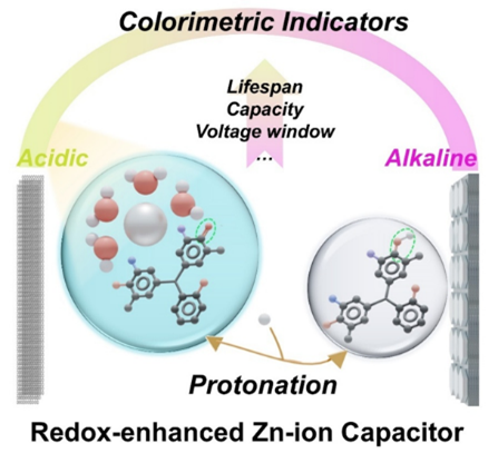 该研究以三苯甲烷染料为pH指示剂,成功开发了适用于氧化还原增强型锌离子混合电容器的多功能氧化还原电解液,创新性实现了pH缓冲、电致变色响应与氧化还原活性的协同集成,为水系储能器件的电解液工程提供了全新设计思路。研究系统揭示了染料的“质子-电子”协同转移行为是调控电解液性能的核心机制:质子转移通过酸碱平衡实现电解液pH动态缓冲,有效抑制锌负极析氢、枝晶生长与副产物生成,同时借助电致变色效应实现器件工作状态的实时可视化诊断;电子转移通过酚-醌可逆氧化还原反应,提升电解液的电荷存储能力,增强 RZICs 的法拉第反应贡献。