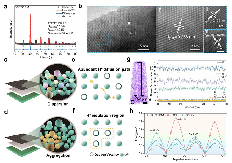 作者为BCZTZICM氧电极开发了一种多元素微掺杂策略,使其具有竞争力的ORR/OER活性和稳定性。高离子分散度实现了17.67×10⁻⁶ K⁻¹的低热膨胀系数和高水合能力,促进了氧和质子的迁移。BCZTZICM在40次热循环测试中表现出可靠的热机械稳定性,没有明显退化。单电池实现了1.56 W cm⁻²的峰值功率密度和2.0 A cm⁻²的电解电流密度。