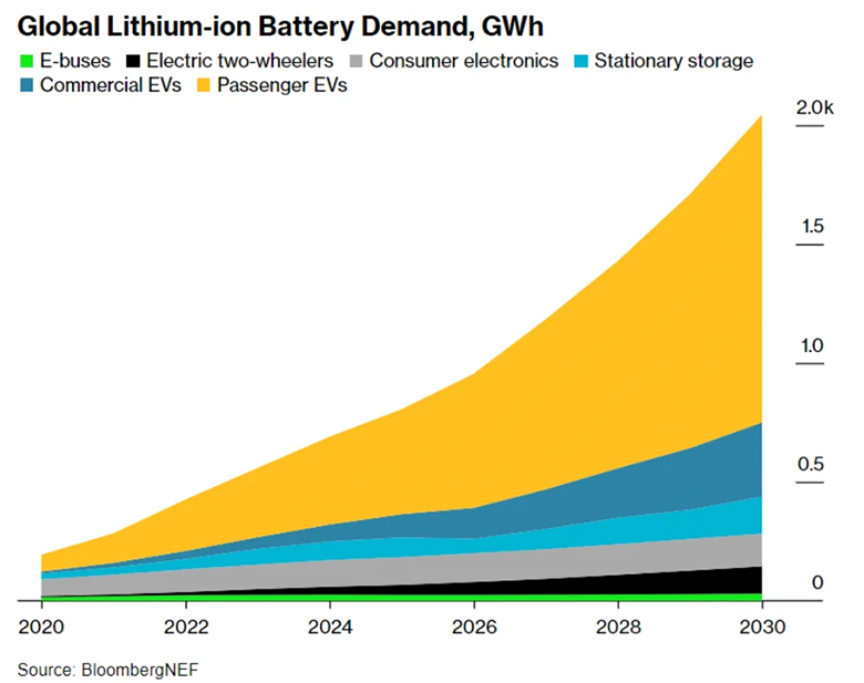 据彭博社估计,未来十年锂离子电池的需求将增加十倍。这一需求激增主要受全球100多个国家实现净零排放承诺的推动。